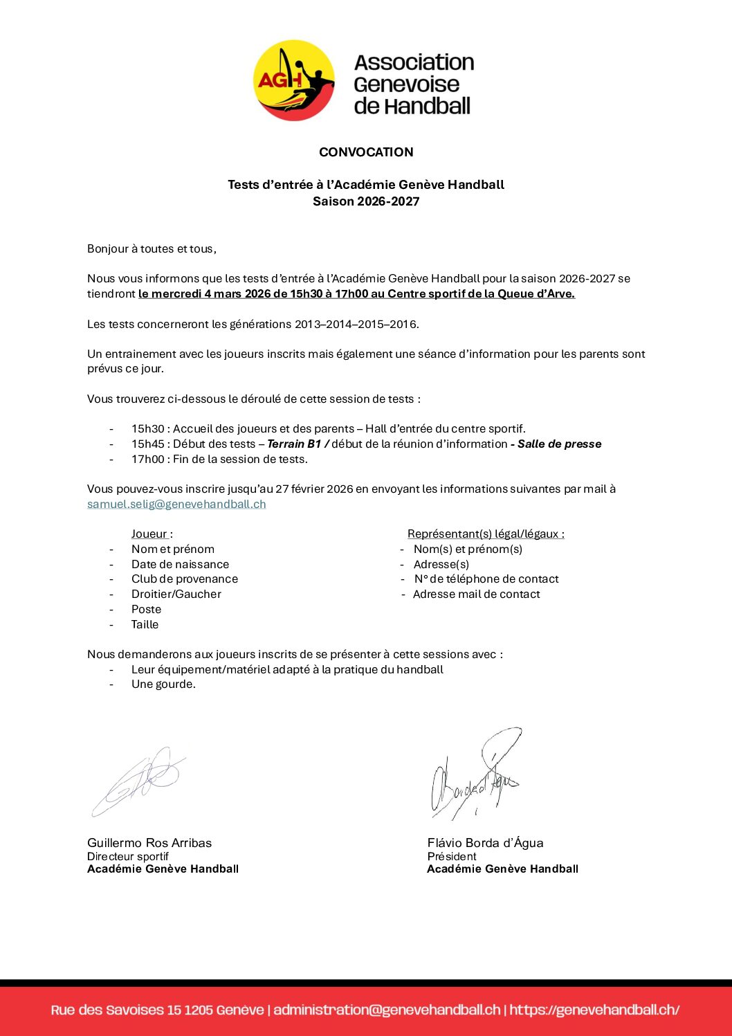L’Académie Genève Handball organise sa journée de détection pour la saison 2026–2027.